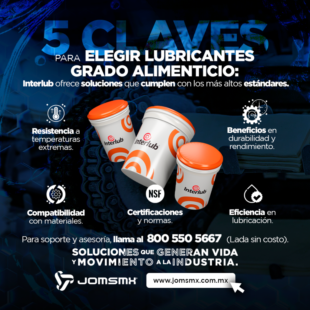 Seleccionar el lubricante grado alimenticio adecuado es crucial para la operación eficiente y segura de la industria alimentaria. Interlub ofrece una gama de productos que cumplen con las más altas exigencias, asegurando la continuidad de las operaciones sin riesgos. En JOMS de México, estamos comprometidos con ofrecer soluciones que generen vida y movimiento a la industria. Contáctanos hoy para conocer más sobre nuestras opciones en lubricantes grado alimenticio.