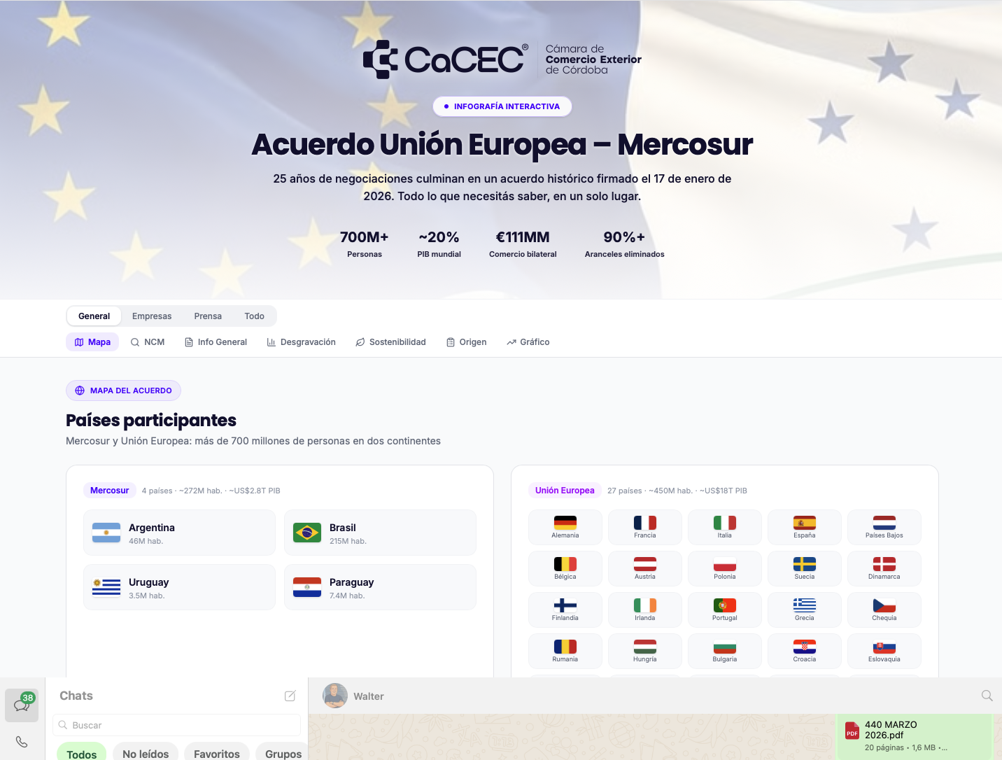 En el marco del acuerdo comercial entre el Mercosur y la Unión Europea, la Cámara de Comercio Exterior de Córdoba (CaCEC) elaboró una infografía interactiva destinada a explicar de manera sencilla y práctica qué cambios traerá este tratado para el comercio internacional y, en particular, para las empresas de la provincia.