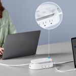 This modernized power strip is flat, slim, and features two AC outlets on top along with two USB-C and two USB-A ports along the bottom edge. With 140 watts of charging power, this thing is pretty darn fast, capable of fully charging a MacBook Pro in just over an hour. Both USB-Cs can reach that 140W max when used solo, while the USB-As are capped at 12W each. When using more than one port at once, the USB-Cs can get capped at 65W or 60W depending on the charging configuration.