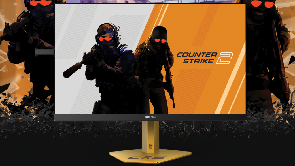 The Agon CS24A is almost identical with a couple of extra features… and yeah, that “CS2” in the model number is no coincidence. It’s branded with Counter-Strike 2, leaning into what is perhaps the most competitive of competitive shooters. While this version of the monitor uses the same panel, it drops the response time down to just 0.3 milliseconds and adds in official Nvidia G-Sync support. Plus, the stand is an incredibly tacky gold color, with a CS logo and a silhouette of a shooty dood.