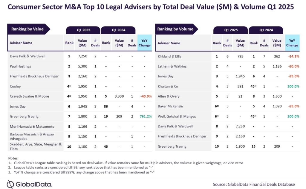 Davis Polk & Wardwell and Kirkland & Ellis emerged as the top mergers and acquisitions (M&A) legal advisers in the consumer sector during the first quarter of 2025, analysis of deal data suggests.