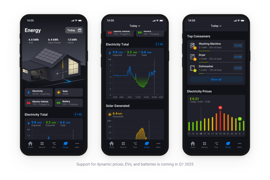 The energy-monitoring feature appears in a new Energy tab in the Homey app. It tracks data from whole-home energy meters, solar panel inverters, and energy-measuring devices—including the Emporia Home Energy Monitor, the Shelly Pro 3EM, and Athom’s own Homey Energy Dongle and displays that information in easy-to-read charts. Provide your utilities’ rates and the app will show you how much it costs to operate your home.