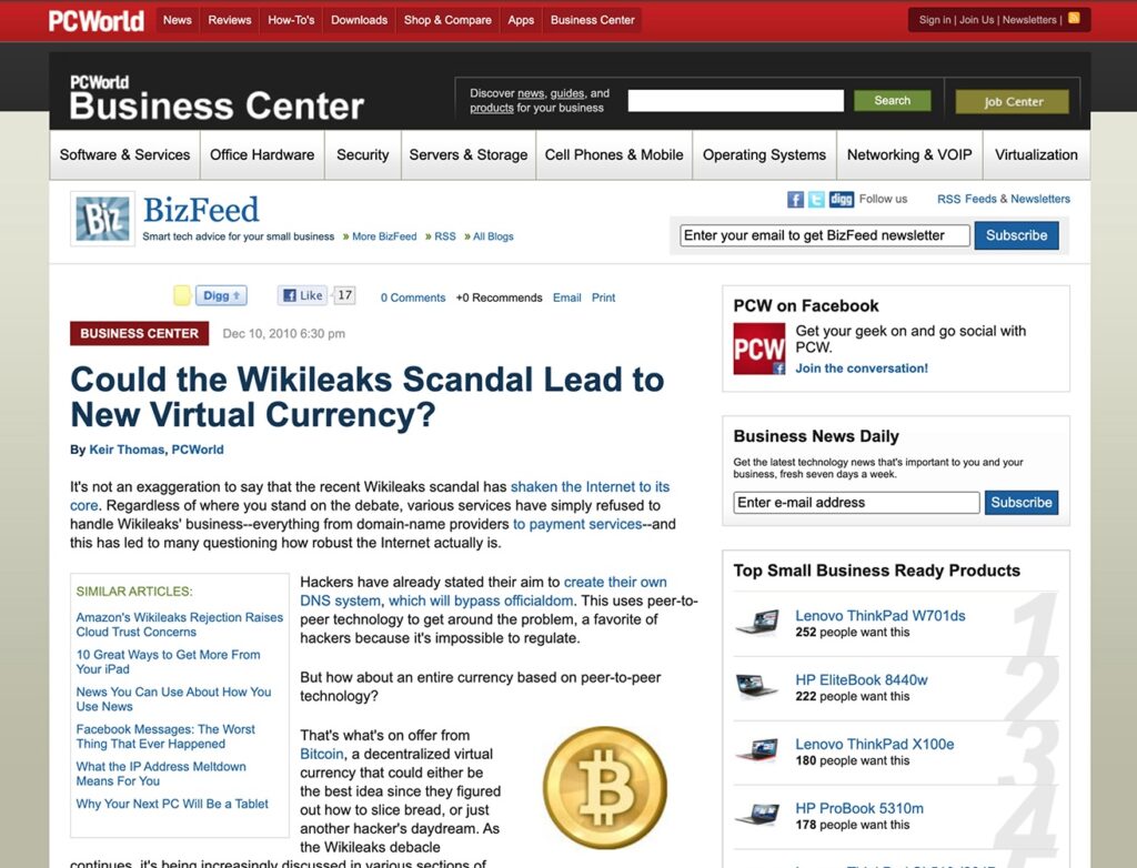 As a media brand, especially in the tech sector, you are rarely actively involved in a historical moment. Even less frequently, you’re the trigger for that moment. But PCWorld unintentionally found itself in just that position, creating computer history back in 2010. Here´s what happened.In 2010, Youtube was only five years old. Apple released the iPhone 4 that year. And in April 2010, the New York Times, The Guardian and Der Spiegel published controversial US military papers that were released on Wikileaks, making that platform a household name overnight. This was the tech landscape of 2010.At that time, the virtual currency Bitcoin had existed for little more than one year. The few people who knew about Bitcoin were mining BTC on their home PCs (still possible back then), and the exchange rate for 1BTC was $0.20 to $0.30.Bitcoin controversies over environmental impact and exploding GPU prices were essentially non-existent at that time. Instead, the buzz centered around Bitcoin’s mysterious, idealistic inventor (or entity) named Satoshi Nakamoto, who established the concept of a totally democratic digital currency that couldn´t be controlled by anyone.It was Bitcoin’s unique decentralized nature that inspired a PCWorld freelance author to report that Wikileaks and Bitcoin may be able to work together.With its growing reach, Wikileaks had been trying to collect funding through donations, but many of the major payment systems like Paypal refused to work with the platform due to its controversial nature. But what if Bitcoin could become a viable Paypal alternative?PCWorld author Keir Thomas introduced that concept in a Dec 2010 article titled “Could the Wikileaks Scandal Lead to New Virtual Currency?“ The article was completely factual, and never advocated for Wikileaks in any political sense. Nonetheless, the story still raised the attention of Satoshi Nakamoto, who reacted one day after the story went live by posting his final public comment ever in an online forum:“It would have been nice to get this attention in any other context. WikiLeaks has kicked the hornet’s nest, and the swarm is headed towards us.”