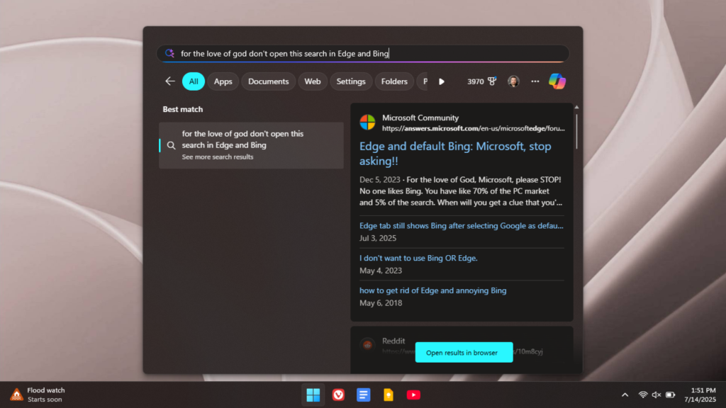 I like Windows 11 a lot less than I liked Windows 10—and that was before it started advertising to me incessantly and filling up every nook and cranny of the experience with “AI” I neither wanted nor asked for. But one of the oldest annoyances is that it still demands I use Microsoft’s Edge browser and Bing search for everything, including the searches made in the otherwise very handy Start menu search.