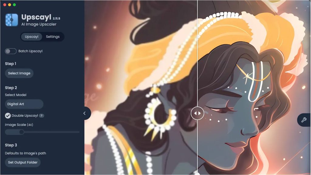 As soon as the processing is complete, check the new image. To compare the original and the upscaled version, Upscayl displays a slider.