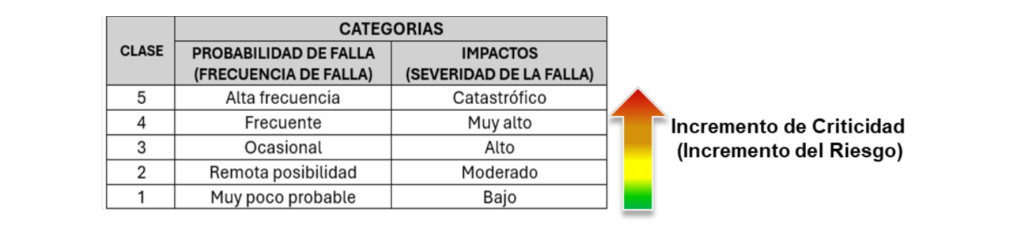 Según sea el nivel de impacto y la probabilidad de falla los subdividimos en categorías, que permiten agrupar estos impactos y frecuencias en un rango desde muy bajo o poco probable, hasta muy alto impacto o de muy alta probabilidad de ocurrencia.