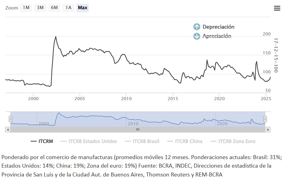 La evolución histórica del Índice de TCRM nos ayuda a evaluar la posición actual. Cuando aumenta, los bienes y servicios argentinos se vuelven relativamente más baratos en el exterior (hay depreciación), lo que favorece las exportaciones. Cuando disminuye, esos productos se encarecen (hay apreciación) y las exportaciones no pueden competir en el mercado internacional facilitando el ingreso de importaciones. A finales de la Convertibilidad el índice se ubicaba en 65 y nuestros productos eran muy costosos internacionalmente lo que deterioró nuestra balanza comercial. En 2002 se situó por encima de los 200 puntos, bajando a 80 luego de 2008. Entre 2015-2019 nuevamente se recompuso superando los 100 puntos. A partir de fines de 2023, con la devaluación del 54% y el crawling peg se ubicó en los 160 puntos, con lo que el país quedó barato en dólares. Sin embargo, durante 2024 fue bajando hasta ubicarse en los 80 puntos. Luego de la liberación del cepo el índice nuevamente se acerca a los 100 puntos, que es el valor estimado de equilibrio.