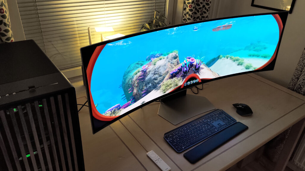 This super-duper-mega-ultrawide has a resolution of 5120×1440, essentially two QHD screens smooshed together on one curved panel. With a 240Hz refresh rate and .03ms response time it’s made for gamers first and foremost, but with HDR10+ support and an amazing picture thanks to OLED’s “perfect” contrast, it’s great for movies or other media, too. With the same software running Samsung’s smart TVs and an included remote, you don’t even need a PC to load up some streaming apps.