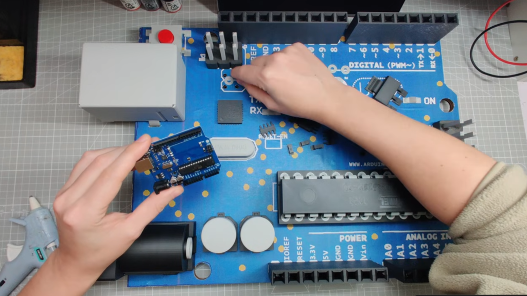 How? Well, there’s a genuine Arduino (a smaller Nano model, not the standard Uno) hiding between layers of plywood, which are pretending to be the printed circuit board via a series of decals. All the functional components are discreetly wired through three layers so they don’t show. That means that this massive thing actually works as a standard Arduino, albeit one without connections to male pins.