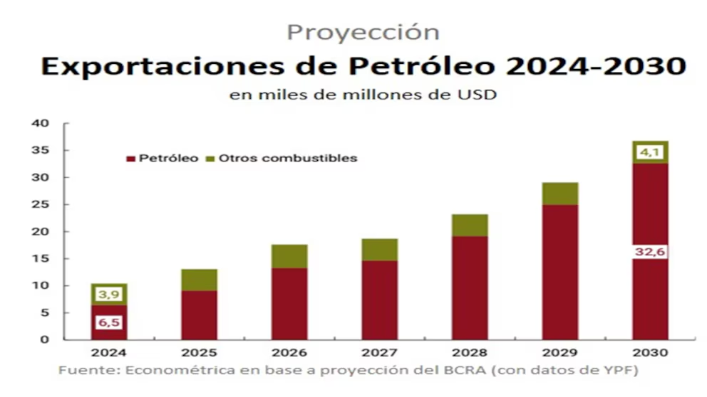 Gracias a las inversiones en el nuevo escenario, el BCRA estima que las exportaciones de petróleo aumentarán más de USD 26.000 millones los próximos cinco años, pasando de los USD 10.400 millones en 2024, a cerca de USD 36.700 millones en 2030.