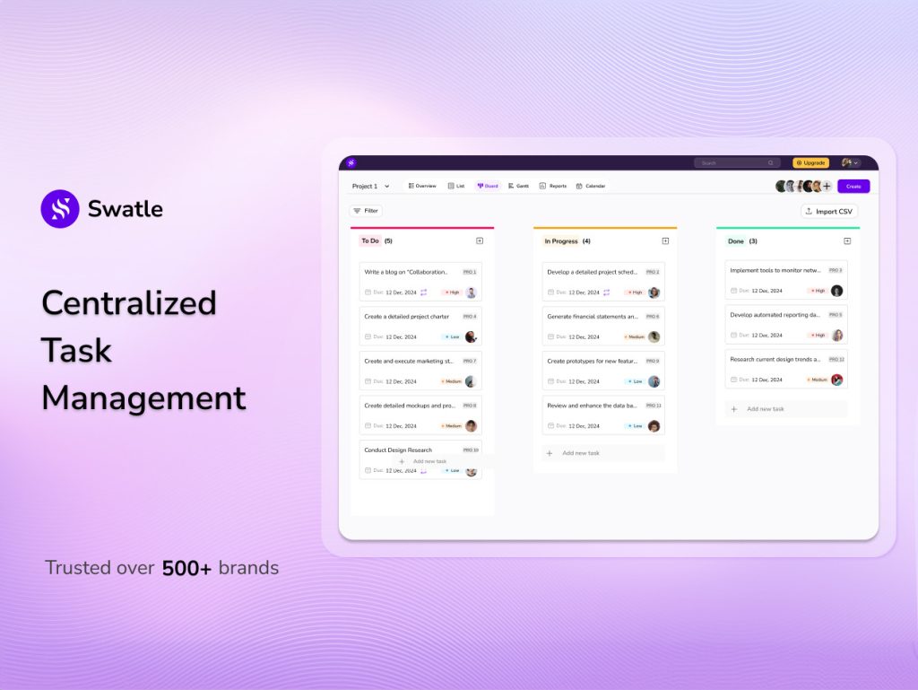 Swatle’s AI project assistant provides step-by-step guidance, actionable updates, and even gives you time estimates on tasks so you can plan your day efficiently. It also helps you work with your team, streamlining communication and file sharing through a Swatle chat.